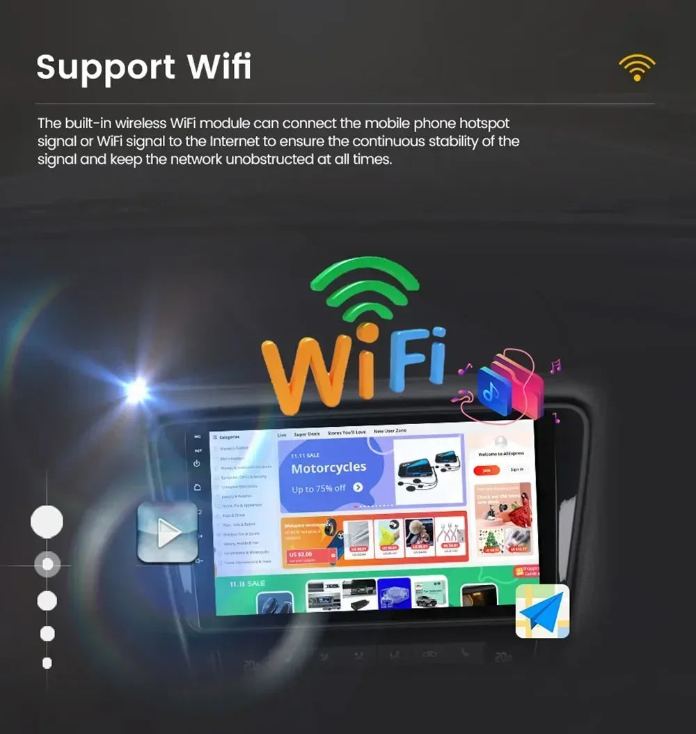 Connectivity & features: Wireless CarPlay, Android Auto, Wi‑Fi, Bluetooth, built‑in GPS, CAN‑BUS support, steering‑wheel control, voice control, DSP, split‑screen, reversing input, support for 3G/4G networks