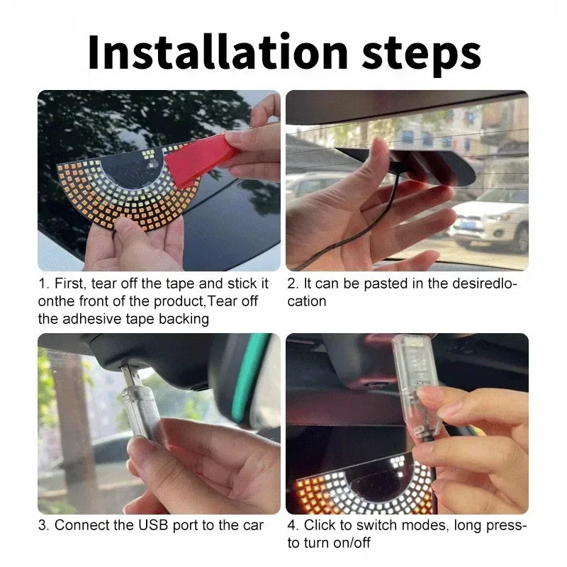 Perfect for both style and safety, this panel light functions as a visual statement and a warning signal for other drivers. Use the double-flash mode for temporary parking visibility or activate breathing lights for a subtle ambient effect. Ideal for use on the windshield or rear window, the device is plug-and-play via USB, with a single-button interface for easy operation—no complicated setup required.